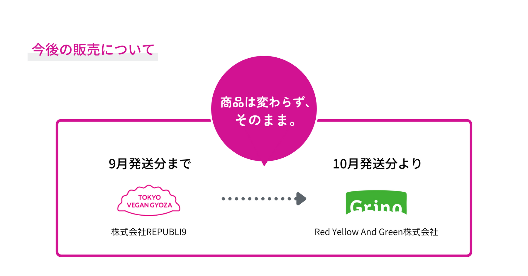 皆さまにご愛顧いただいております「東京ヴィーガン餃子」につきまして、2022年10月1日よりオンラインストアでの販売を、弊社(株式会社REPUBLI9)からプラントベースフードブランド『Grino(グリノ)』を運営する Red Yellow And Green 株式会社に販売委託することになりました。 以前より、東京ヴィーガン餃子をGrino(グリノ)オンラインショップ にて販売いただいておりましたが、同社オンラインショップのお客様からも大変好評だったこともあり、この度、販売委託する運びとなりました。