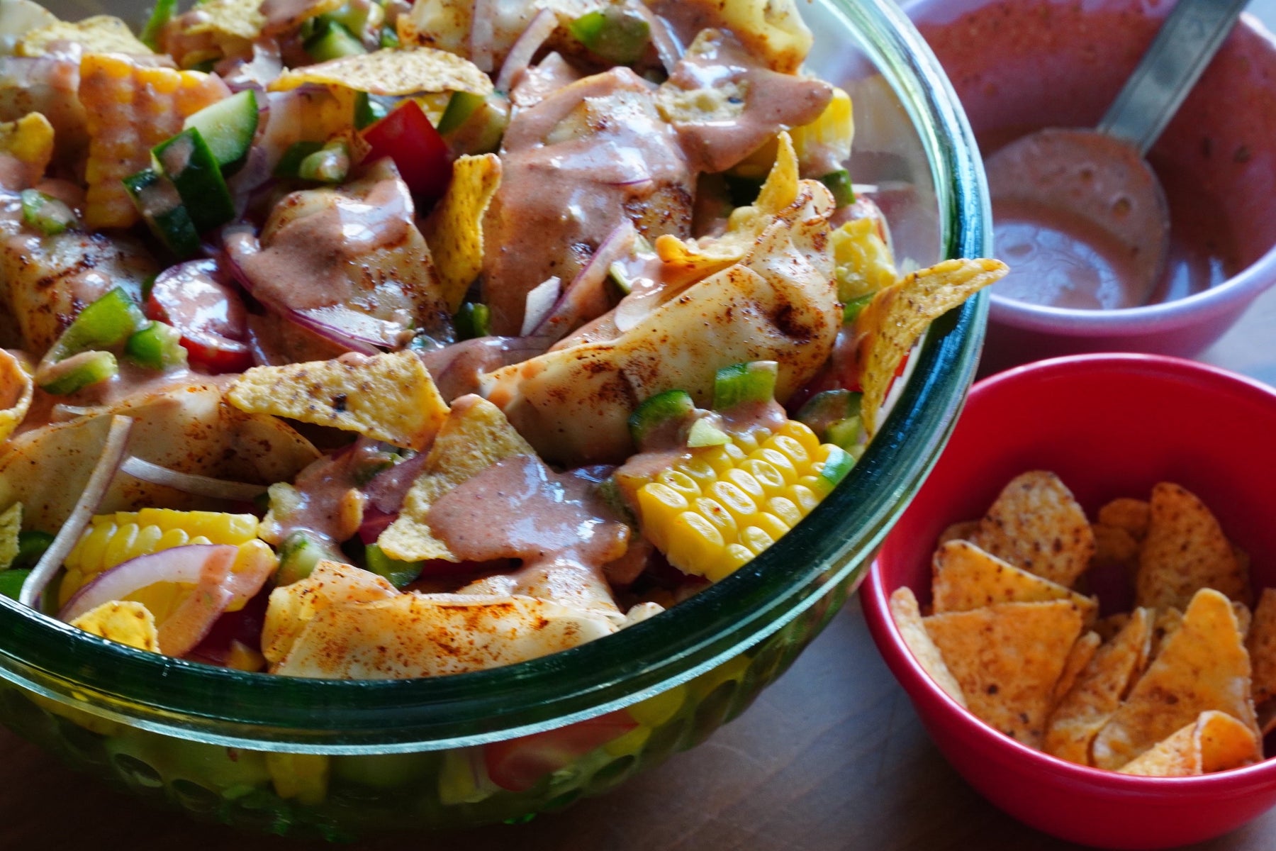 3. ドレッシングの材料を小さなボウルでよく混ぜ合わせる。野菜と餃子をサラダボウルに盛り付けたところに回しかける。トルティーヤチップスを散らす。