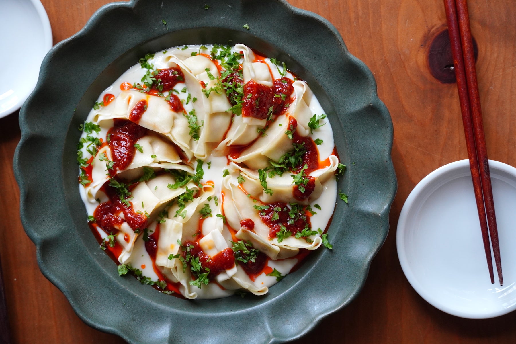 トルコの小さな餃子“マントゥ”。ヴィーガン餃子でアレンジしてみました。爽やかでありながらパンチの効いたヨーグルトソースとピリ辛チリトマトソースが抜群の相性。